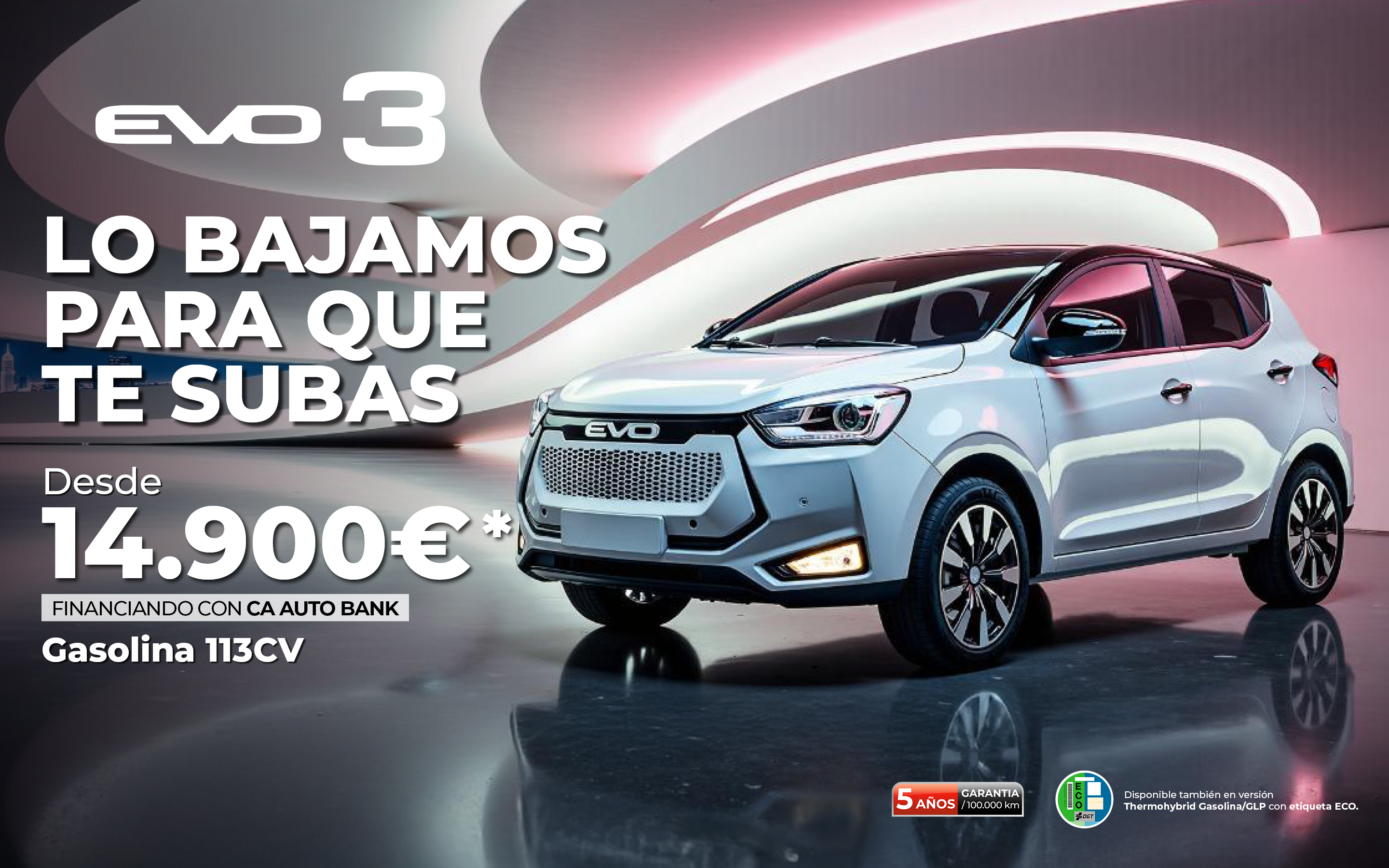 * EVO 3 Gasolina 113 CV. PVP Recomendado Financiando: 14.900€. Incluye IVA,